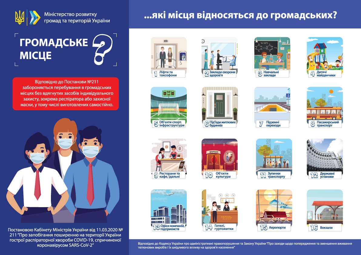 Постановою Кабінету Міністрів України від 11 березня 2020 року № 211 «Про запобігання поширенню на території України гострої респіраторної хвороби COVID-19, спричиненої коронавірусом SARS-CoV-2» (далі – Постанова №211) встановлено карантинний захід в частині заборони перебування в громадських місцях без вдягнутих засобів індивідуального захисту, зокрема респіратора або захисної маски, у тому числі виготовлених самостійно.