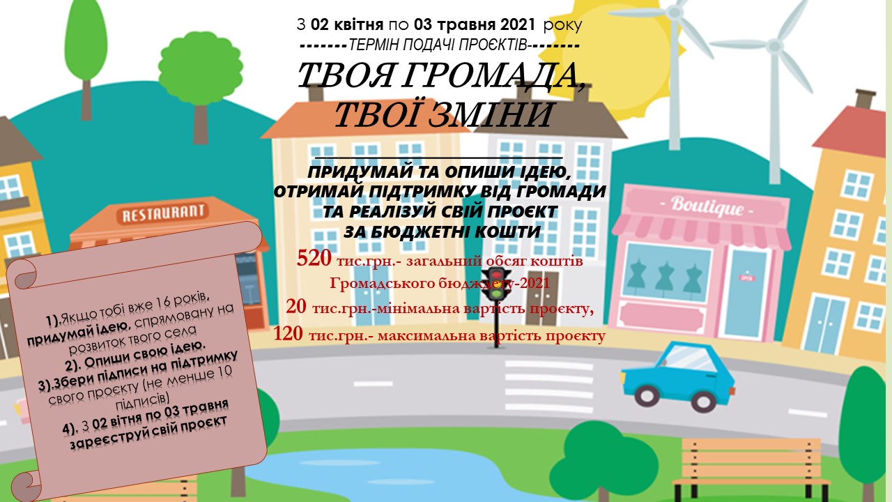 Подавайте свої проєкти і голосуйте за цікаві ідеї. Проєкти, які підтримають найбільше мешканців громади, будуть реалізовані з бюджету громади у 2021-22 роках.
