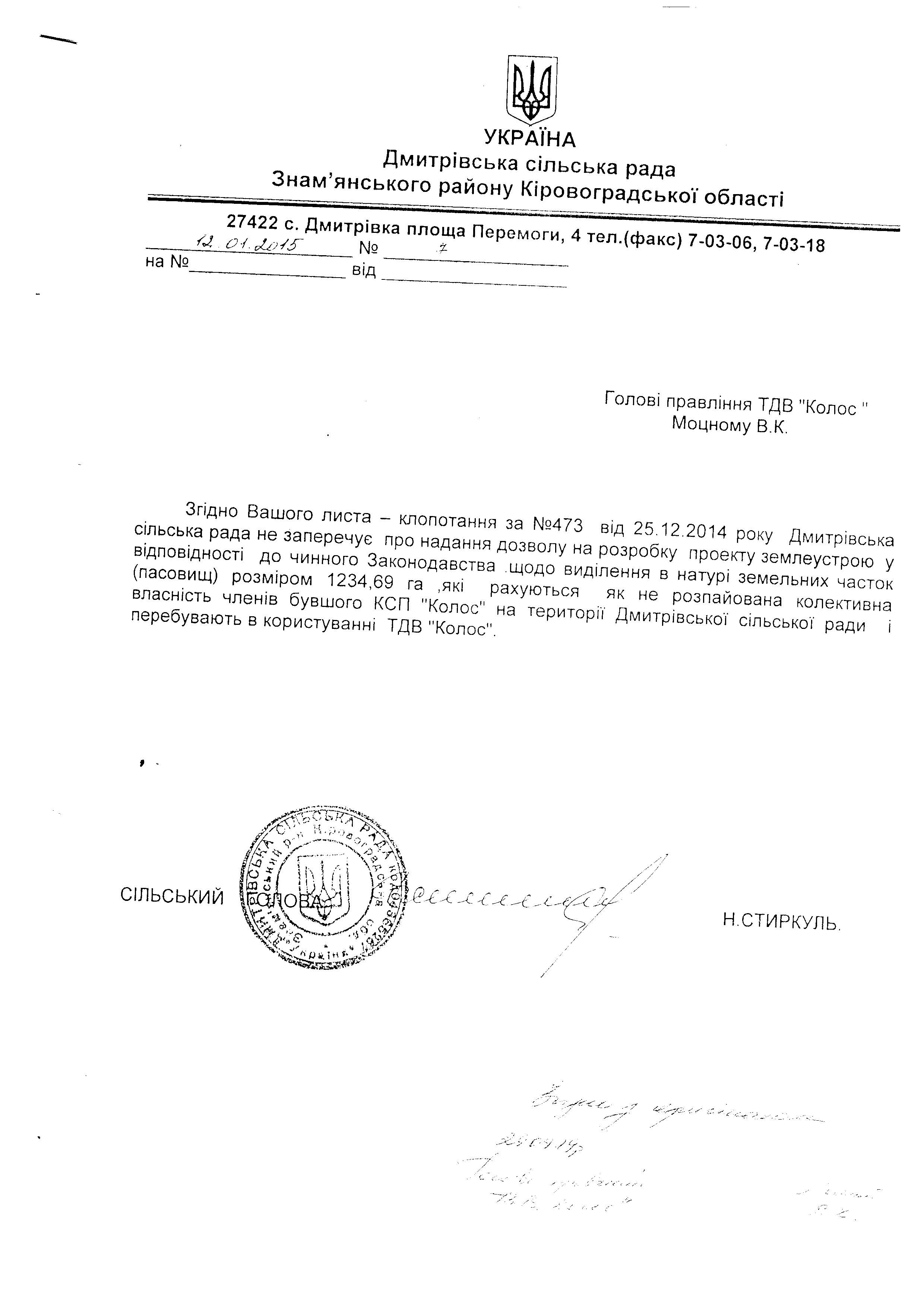 Довідково: З моменту розпаювання колективної власності АТ «Колос» минуло 24 роки. Під час розпаювання рілля була розподілена між членами КСП АТ «Колос», а пасовища загальною площею 1234 га залишились в колективній власності. Всі ці роки сільськогосподарське підприємство «Колос» використовувало ці земельні ділянки (пасовища) для ведення товарного сільськогосподарського виробництва. ТДВ «Колос» в 2014 році став правонаступником СВК «Колос».