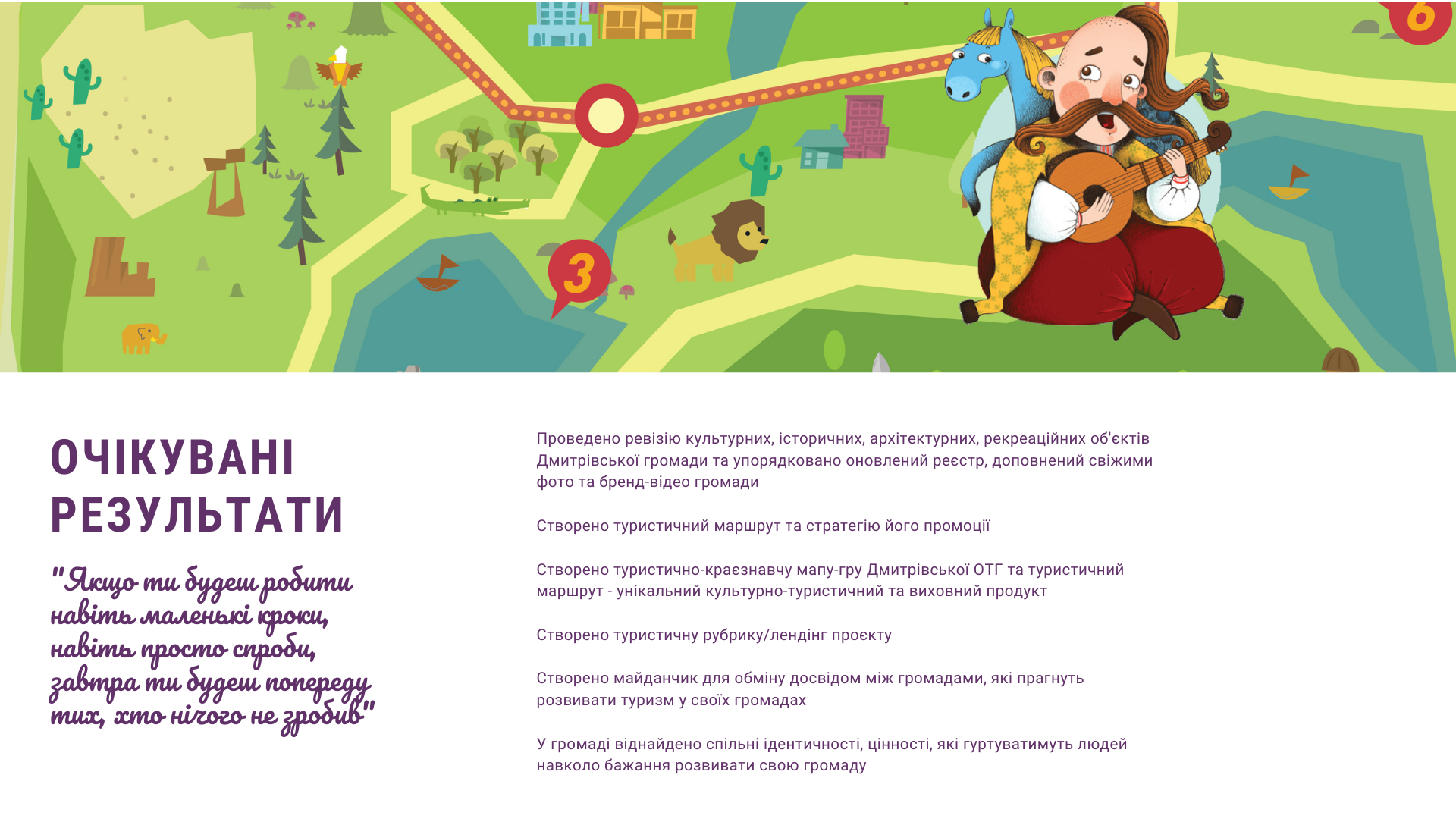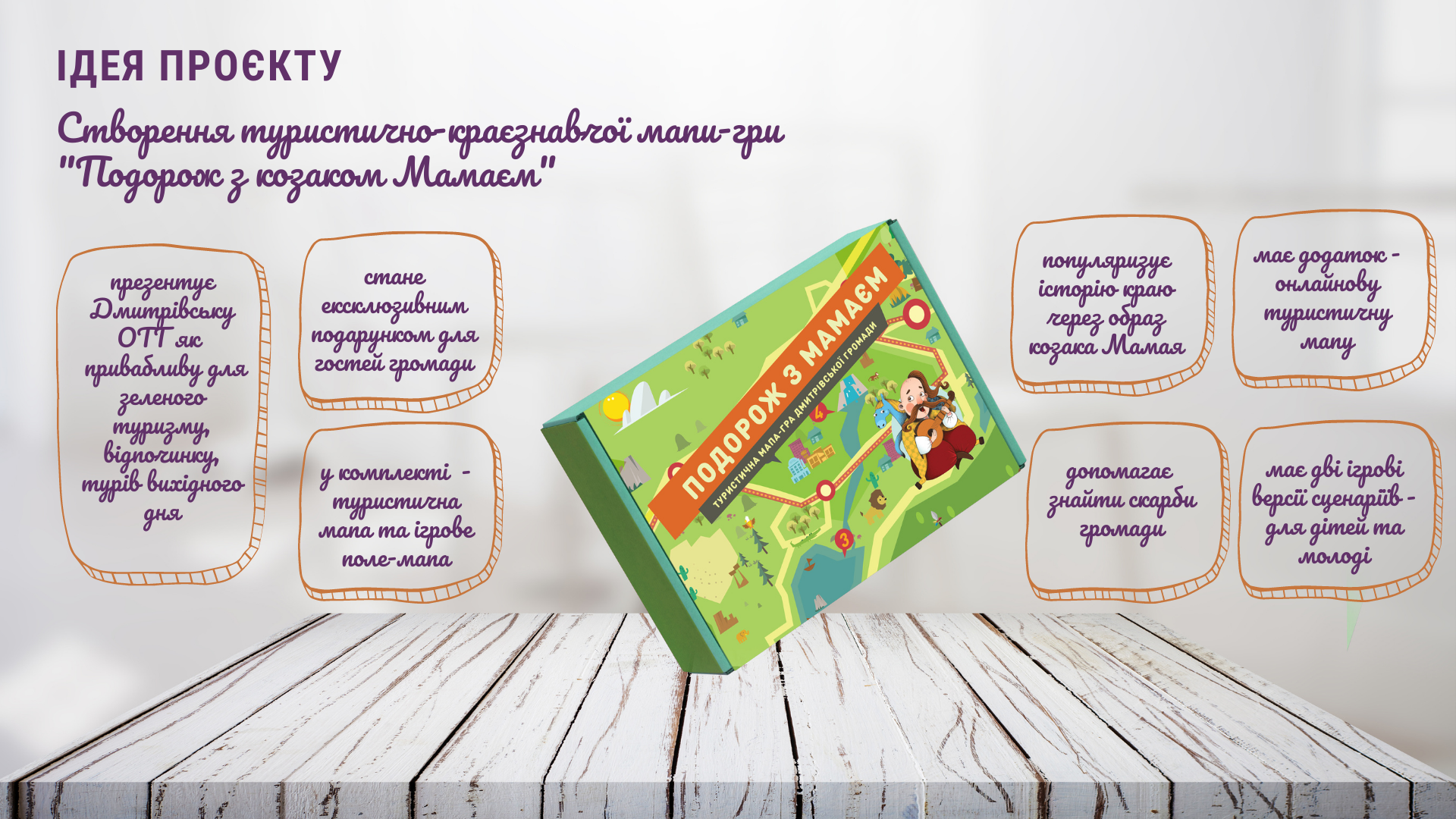 Ігрова варіація мапи стане незабутньою пригодою для дітей та молоді. Козак Мамай покличе у мандрівку, в якій можна знайти скарби громади, розкодувати давні послання та стати героями. Очікуємо, що мапа-гра стане помічницею у роботі вчителів, вихователів, культурних працівників та бібліотекарів громади.