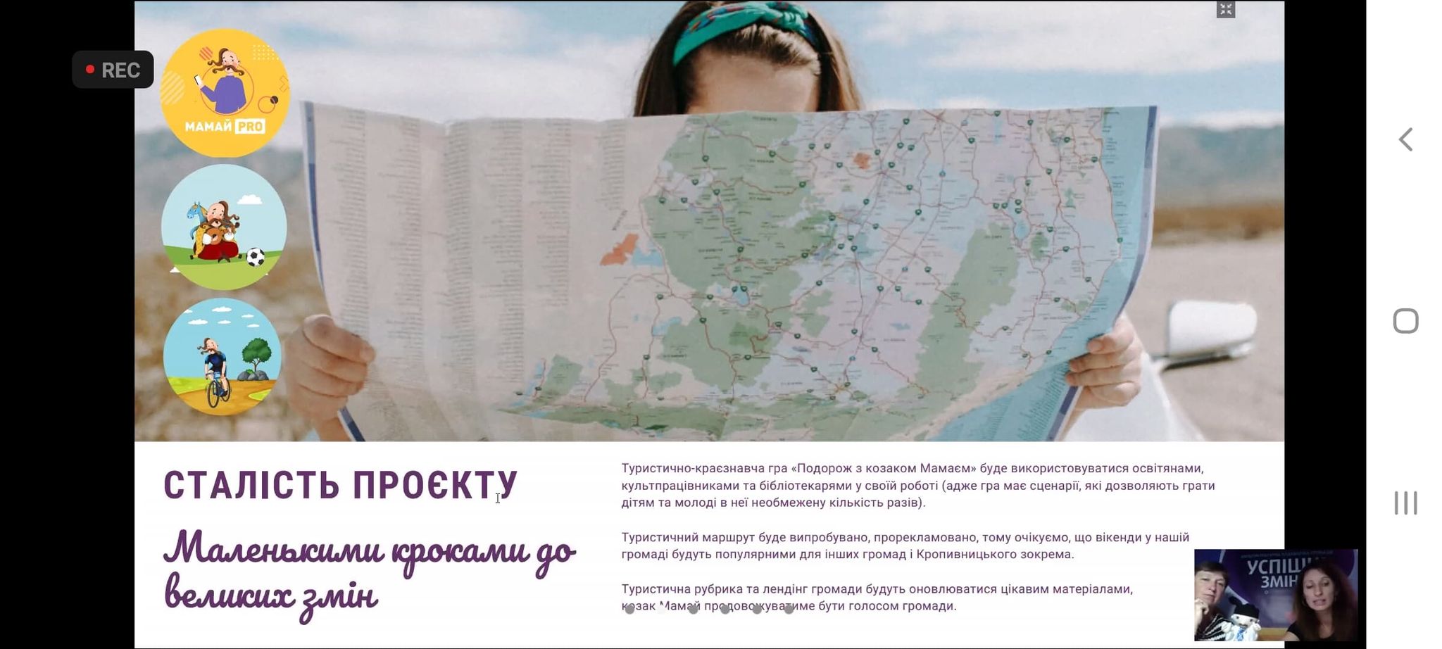 У проєкті Мультикультурна платформа громади "Успішні зміни" козак Мамай став помічником. Ідея перетворити його на мандрівника, блогера, спортсмена виникла спонтанно і, як кажуть, ідея виявилася вдалою.
