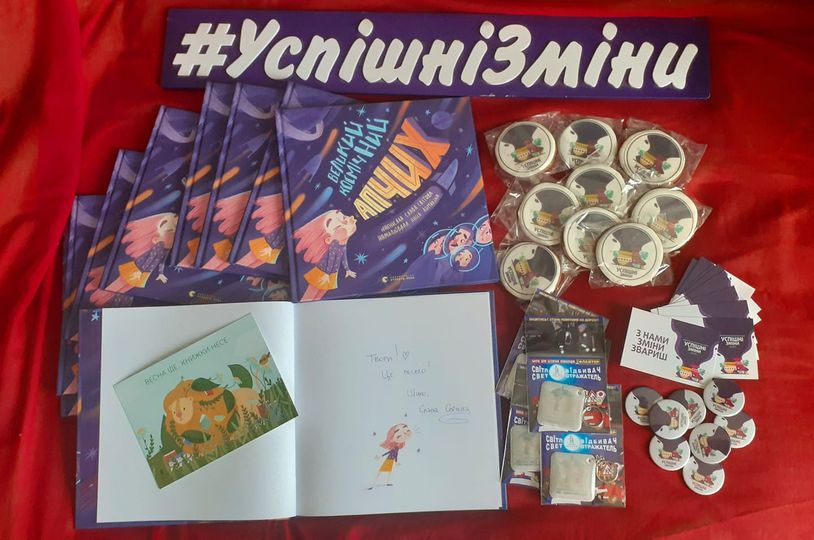 У подарунковому комплекті додається мега корисний подарунок - світловідбивач від освітньої платформи МедіаРеВізія та Агенція сталого розвитку "Хмарочос", а також сувенірна продукція від ГО "Платформа успішних змін"