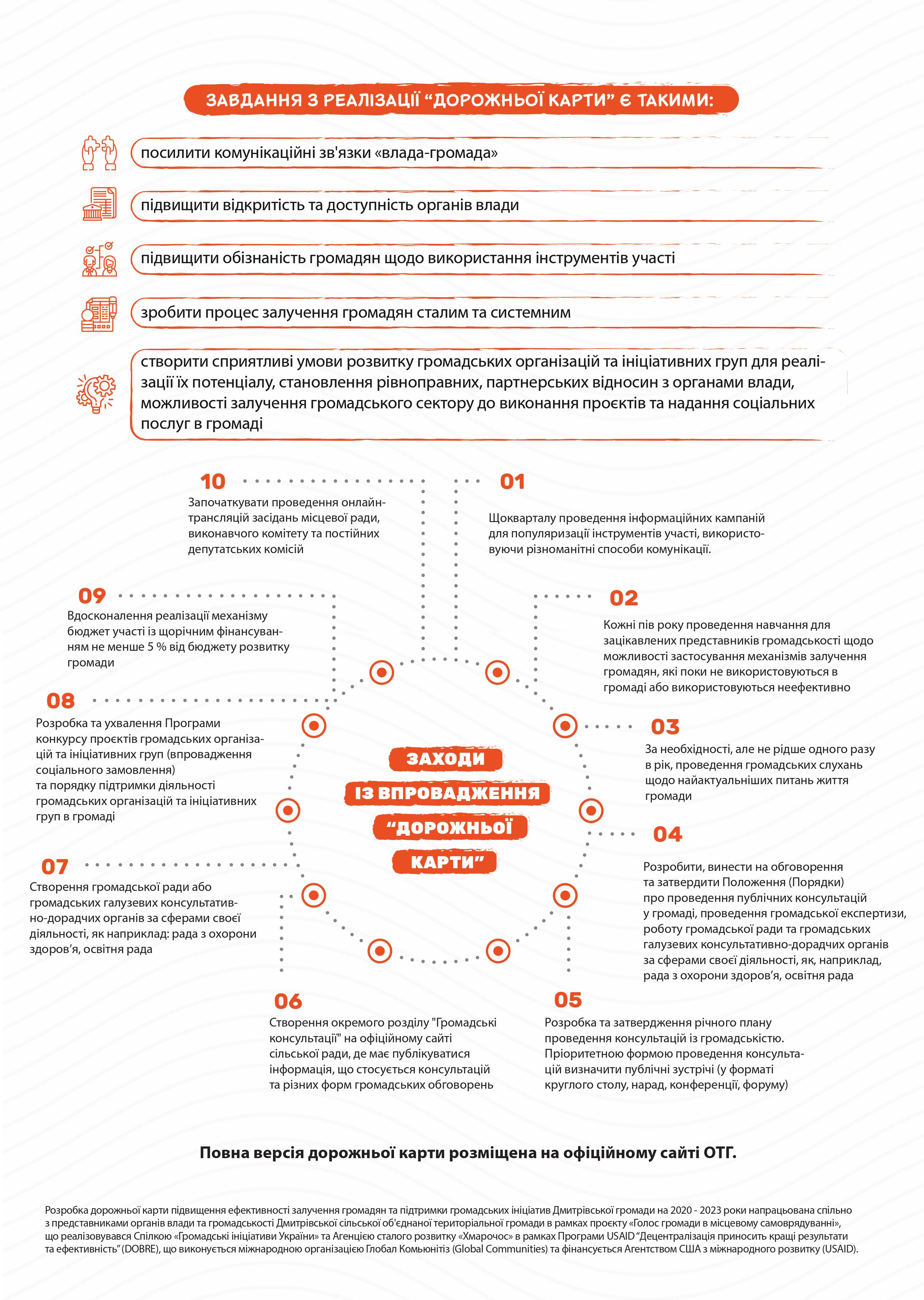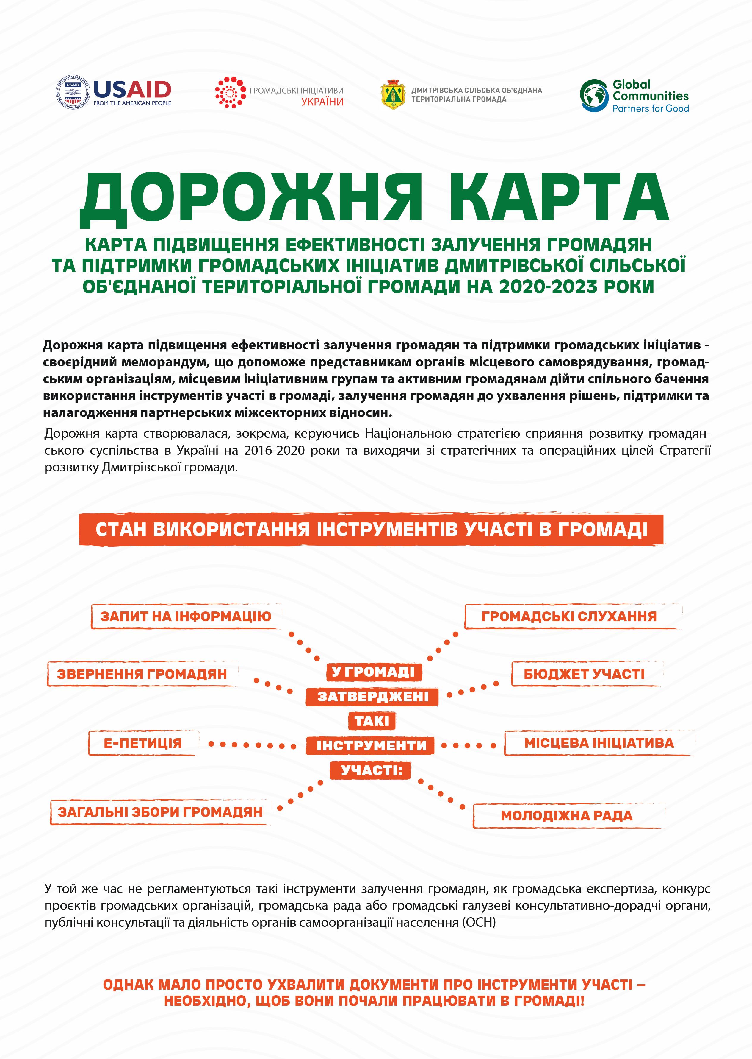 В рамках проєкту «Голос громади в місцевому самоврядуванні», що реалізовувався Спілкою «Громадські ініціативи України» та Агенцією сталого розвитку «Хмарочос» в рамках Програми USAID «Децентралізація приносить кращі результати та ефективність» (DOBRE) розроблено дорожню карту підвищення ефективності залучення громадян та підтримки громадських ініціатив Дмитрівської громади на 2020 - 2023 роки.